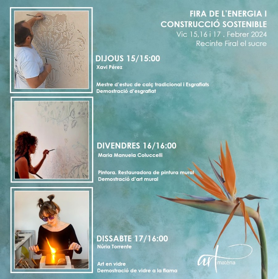 Pel que fa a la Fira, a banda de l’espai expositiu, comptarà amb diferents activitats paral·leles com trobades professionals, conferències, projeccions audiovisuals, demostracions, entre altres. També podrem gaudir de la segona trobada d’artesans i artesanes de la construcció, amb tècniques constructives i materials de baix impacte energètic, com ara la construcció amb terra, calç, fusta, volta catalana, canyes, palla, pedra, etc. En aquest espai es podrà gaudir de demostracions i tallers de totes les tècniques de bioconstrucció.